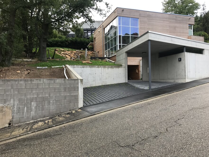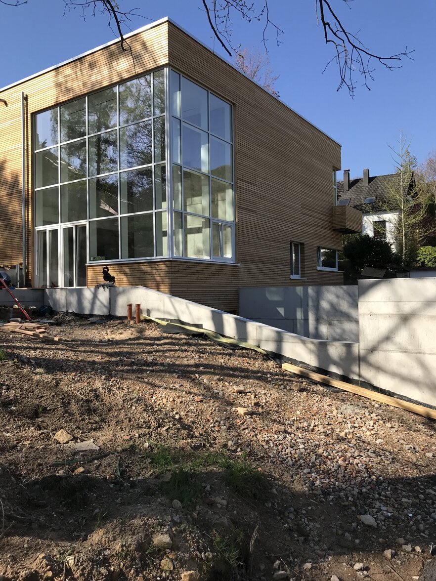 Im bestehenden baulichen Umfeld von Neustadt-Hambach entstand in steiler Hanglage das vollständig barrierefreie Wohnhaus. Die Materialgestaltung ist puristisch und einfach.