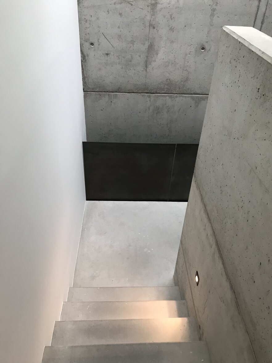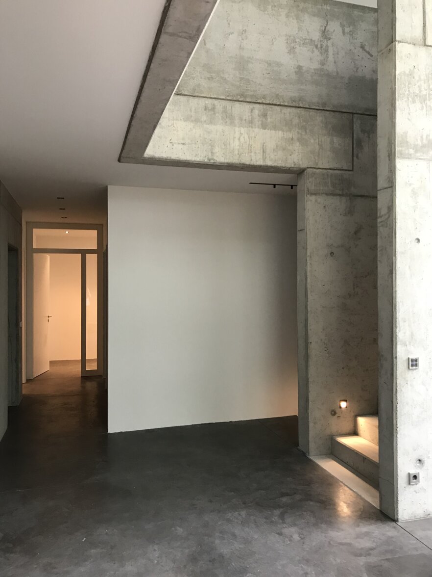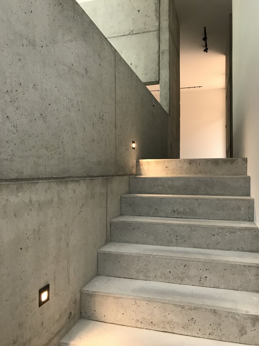 Das Erscheinungsbild im Inneren des Gebäudes wird durch die Sichtbetonoberflächen, die dunklen Betonböden und die zurückhaltend weiß gehaltenen Wand- und Deckenoberflächen bestimmt.