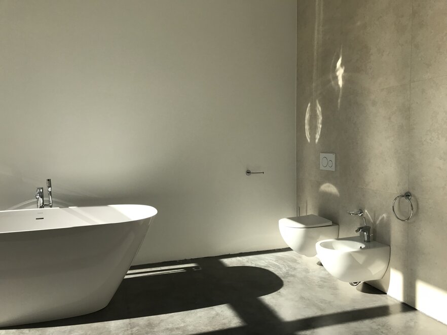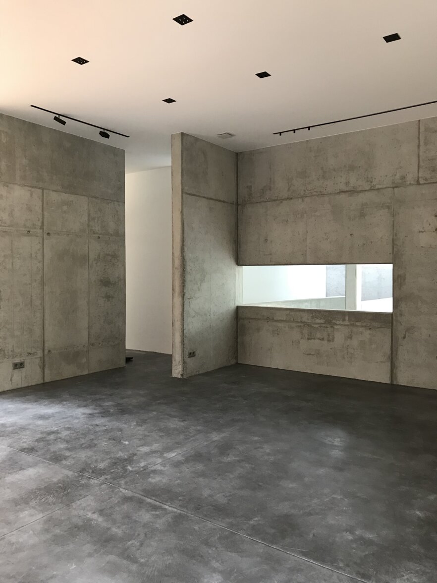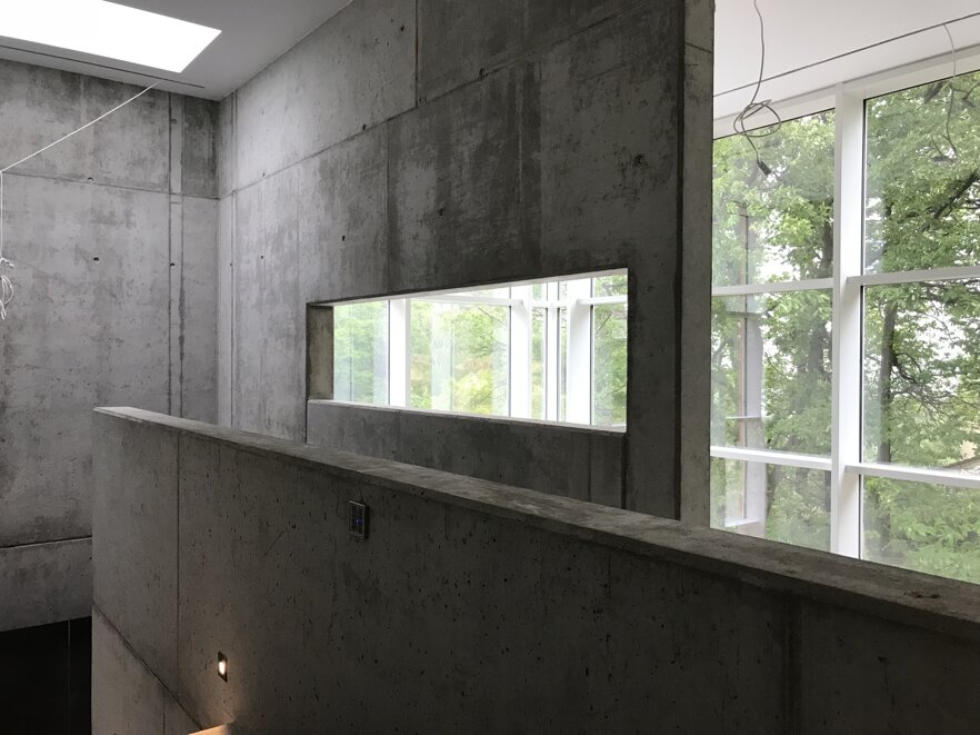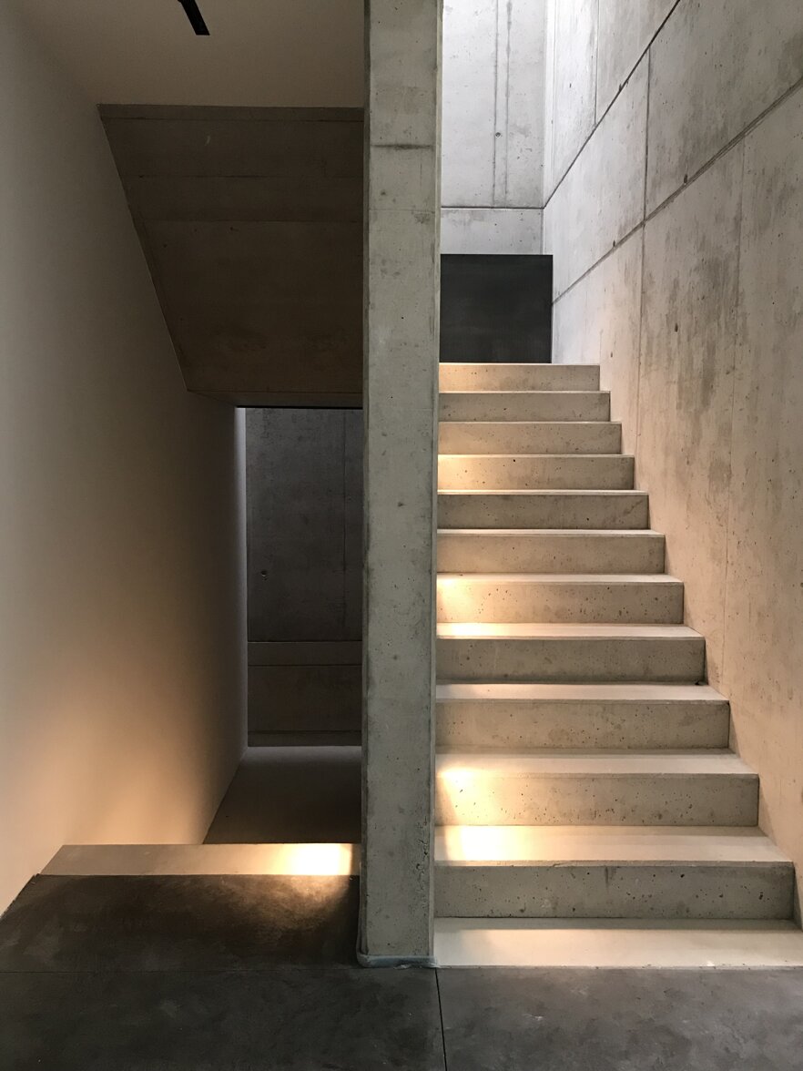 Das Erscheinungsbild im Inneren des Gebäudes wird durch die Sichtbetonoberflächen, die dunklen Betonböden und die zurückhaltend weiß gehaltenen Wand- und Deckenoberflächen bestimmt.