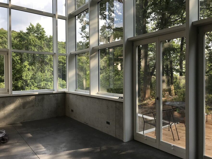 Großflächige Fensteröffnungen schaffen auf allen Ebenen den Bezug der großzügigen Räume zum Garten - ohne dabei ungewollte direkte Einblicke von außen zuzulassen - und erlauben durch die Lichtführung eine Inszenierung der zurückhaltend eingesetzten Möblierung.